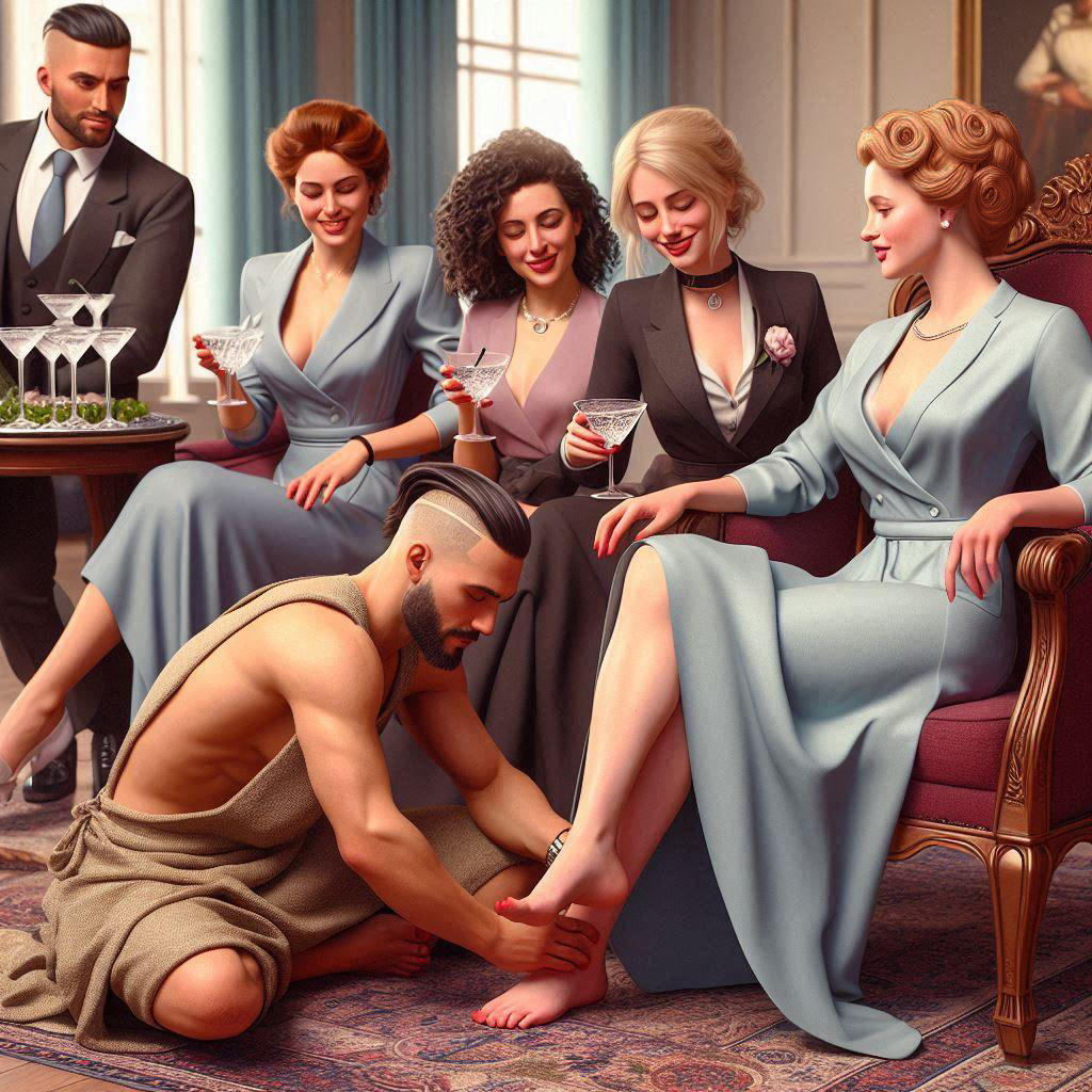 Da der Winter uns Schuh- und Stiefelhorterinnen ja immer wieder vor ganz besonders matschige Herausforderungen stellt, habe ich kurzerhand den guten F. mit seinem Schuhputzkästchen in einer kleinen, dem Festraum angrenzenden Kerkerzelle einquartiert. Als (selbstverständlich nacktes) Service Add-On. Dort konnte er dann nämlich zeigen, was wirklich in ihm steckt und sich durch den bunten Haufen herrlichen Damenschuhwerkes wienern, zu dem alle Damen kräftig beigesteuert hatten.