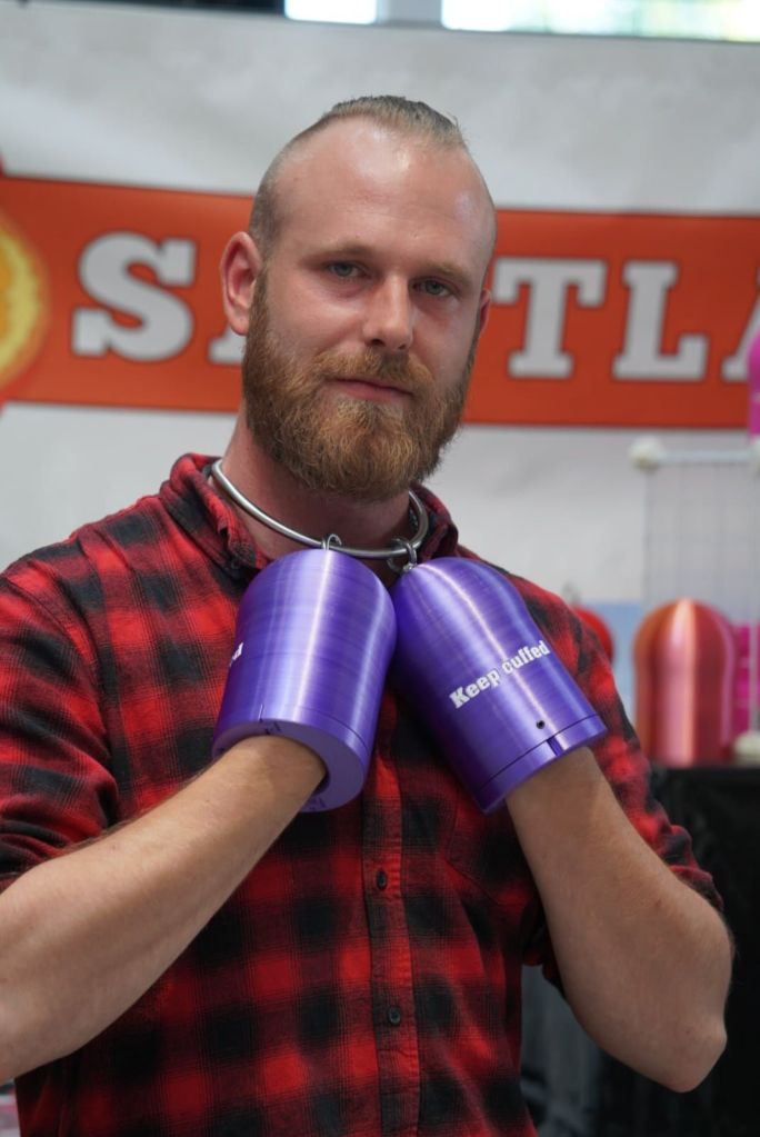 Die „Hausmesse“ wurde gemeinsam mit Skunkworx organisiert und hatte einige äußerst spannende Aussteller am Start, unter anderen z.B. Fernando Berlin (welche wunderbare, aber leider sauteure Stiefel maßanfertigen), Rosengarn Latexdesign, Dino Sadino und Saftladen Originals. Auf letztere war mein Eigentum besonders scharf, da es sich bereits auf Instagram unsterblich in deren pinke „Bondage Mitts“ verliebt hatte.