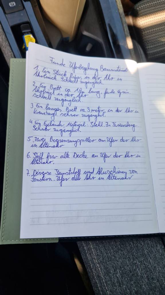 Als nächster Punkt stand die Baustellen-Aufgabe an, bei dieser musste ich drastisch überlegen, wo mir noch Trümmer am Ufer der Ahr einfielen, zu dem es ja brauchbares Material sein sollte. Aber auch da hatte ich drei Abschnitte im Kopf, wo ich fündig wurde. Diese Aufgabe wurde dann ebenfalls abgehakt, Details wurden wie alles andere in meinem Heft notiert, mit Standort, Zugänglichkeit und Größe, die Fotos wurden dabei an die Commandress weitergeleitet.