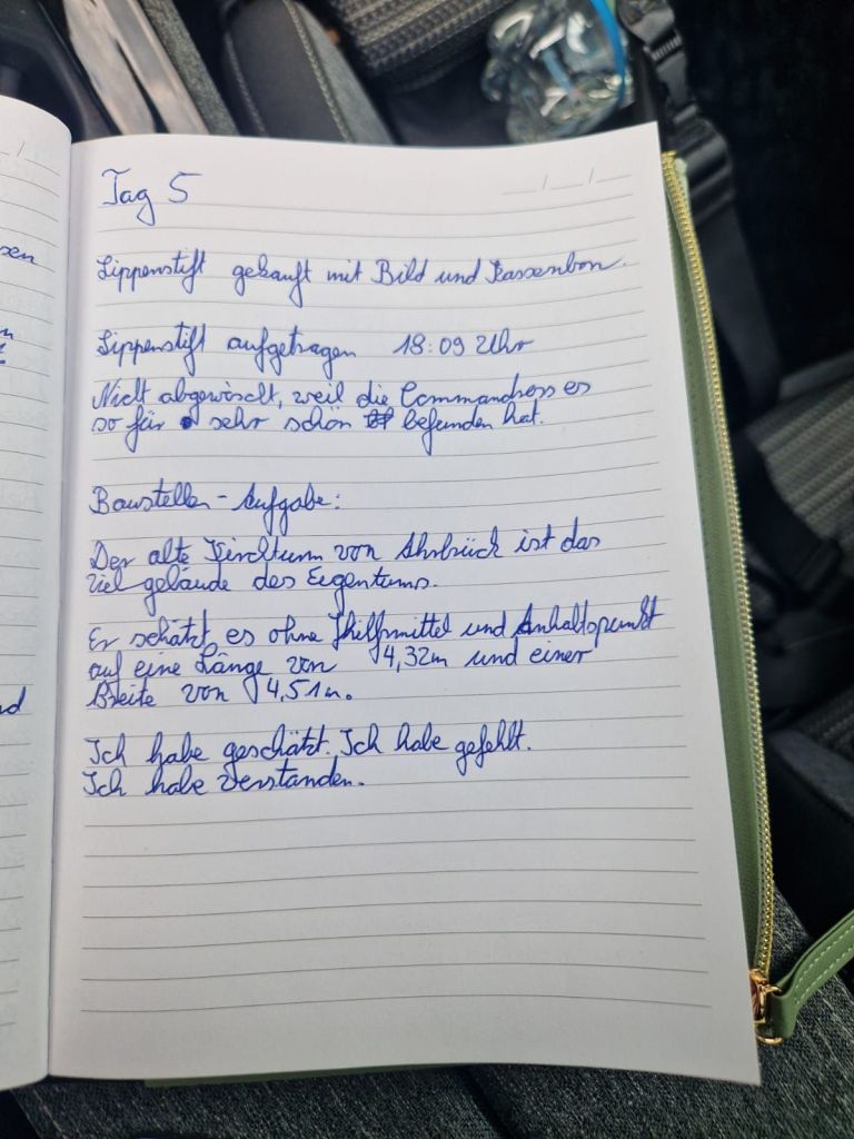 Nicht zu vergessen: All das geschah einarmig. Mein linker Arm war mit Handschellen am Türgriff fixiert, um gar nicht erst auf die Idee zu kommen, ihn zu benutzen. Das Notizbuch fiel ständig von der Armlehne des Autos. Ich mühte mich wirklich ab. Doch zu jeder Zeit war mein Ehrgeiz geweckt – ich wollte der Commandress gefallen und mich um meine Punkte bemühen.