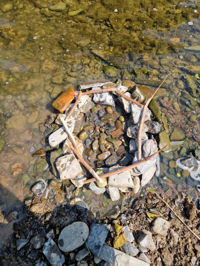 Meine ersten Gedanken waren, diesen Kreis im Wasser zu bauen, um dann das Spiegelbild zu zerbrechen – und damit mich selbst. Leider klappte das wegen der Strömung nicht wie gewünscht. Also füllte ich den Kreis mit kleinen, runden und eckigen Steinchen, um das zersplitterte „Ich“ zu symbolisieren. Es war wirklich schön dort unten am Bach. Ich hätte ewig weiterbauen können. Doch leider rief auch der Alltag – und die Pflicht.