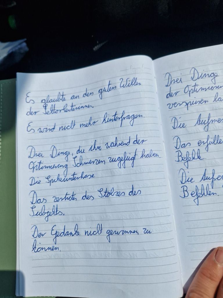 Es hat rückblickend zu benennen, was es einst als Freiheit empfand – und was es heute bereit ist, zu opfern. Es notiert fünf Sätze über seinen früheren Eigenwillen und fünf über seine künftige Unterordnung in sein Heft.